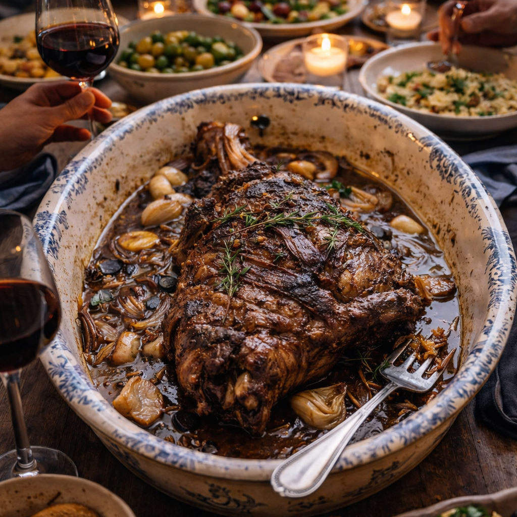 On partage un gigot confit, un poulet rôti, des légumes qui ont mijoté doucement.